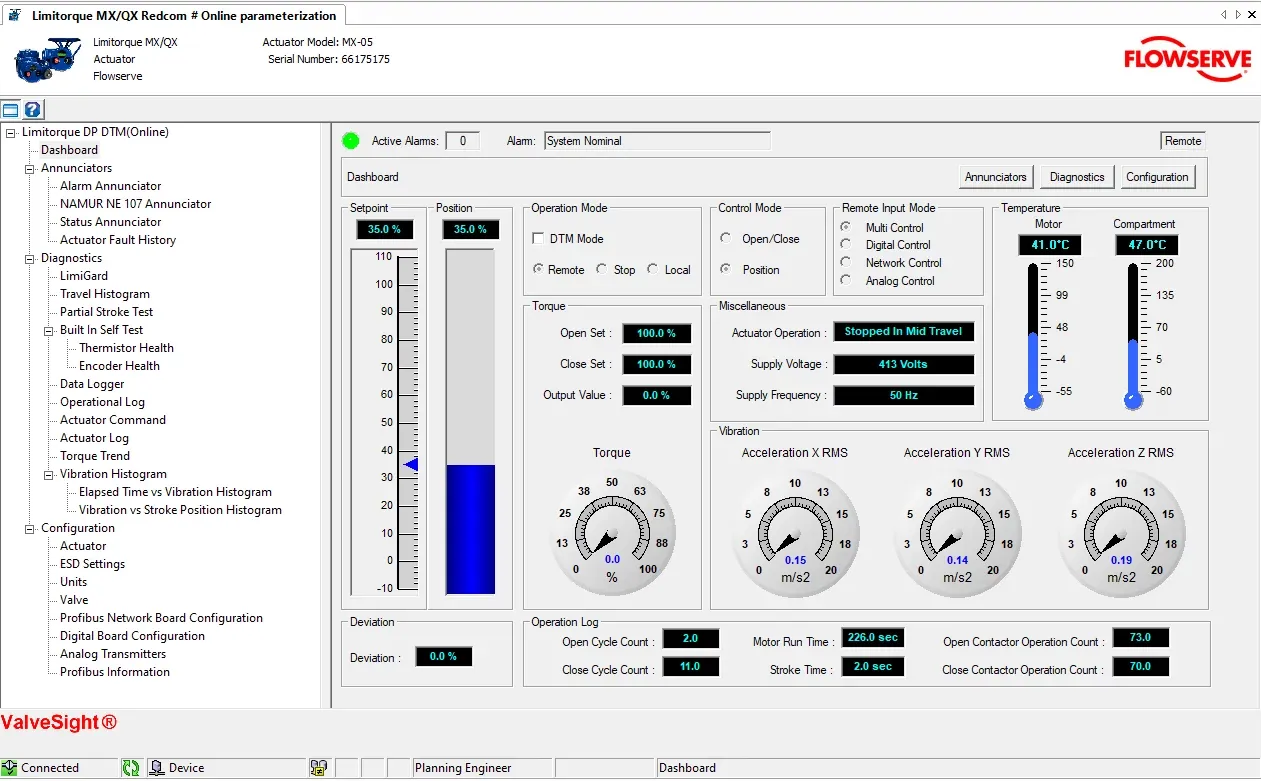 ValveSight is a diagnostic solution for electric actuators/valves that can be seamlessly integrated into a host control and/or plant asset management system. The power of ValveSight is the intelligent diagnostic engine -- which detects an emerging condition in the valve and actuator -- that may indicate a performance, safety, or environmental problem. ValveSight advises which corrective actions to take to prevent a failure.